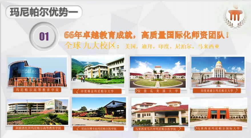 瑪尼帕爾國(guó)際大(dà)學是(shì)以商業(yè)管理(lǐ)、醫(yī)學、工(gōng)程為(wèi)特色和(hé)優勢,兼有(yǒu)建築、通(tō ng)信、信息科(kē)學、生(shēng)物(wù)技(jì)術(shù)等學科(kē)的(de)國(guó)際化(huà)綜合大(dà)學,目前在全球擁有(yǒu)九大(d♦à)校(xiào)區(qū),分(fēn)别在:美(měi)國(guó)、迪拜、印度、尼泊爾、馬來(lái)西(xī)亞。2019年(nián),在亞β洲地(dì)區(qū)排名263名。
