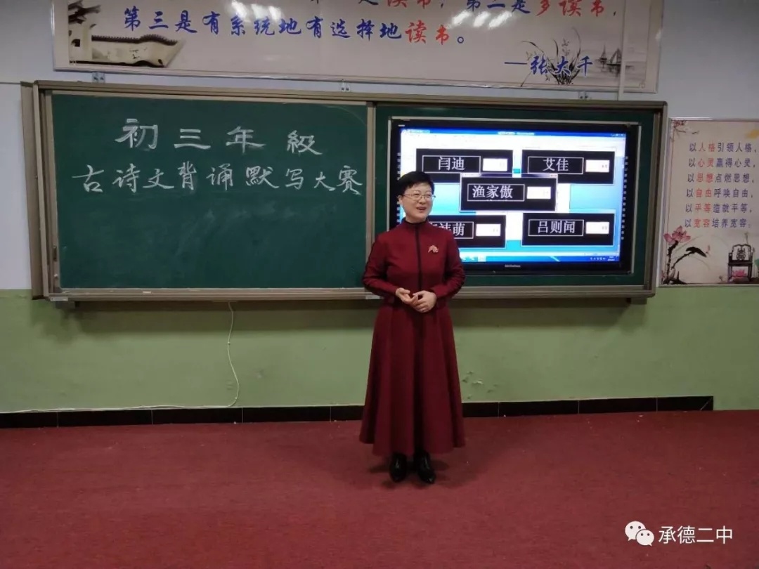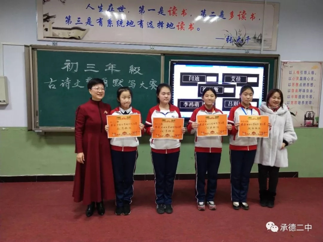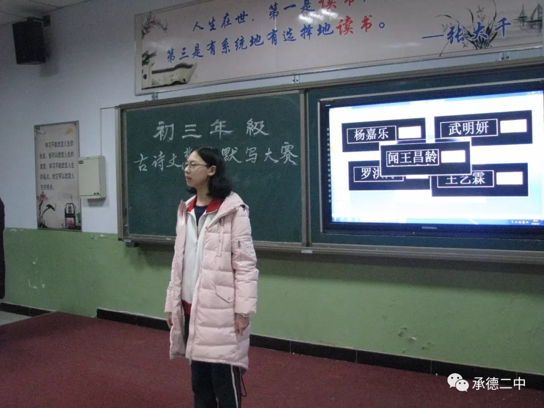 為(wèi)提高(gāo)學生(shēng)古詩文(wén)背誦默寫水(shuǐ)平,提高(gāo)學生(shēng)人(rén)文(wén<)素養,進一(yī)步活躍學校(xiào)文(wén)化(huà)氛圍,檢驗學生(shēng)對(duì)必背篇目的(de)掌握情況,1月(yuè)4日(rì)下(xià)午四點在明(míng)德樓一(yī)階舉行(xíng)了(le)初三年(nián)級古詩文(wén)背誦默寫大(÷dà)賽。大(dà)賽主要(yào)分(fēn)為(wèi)古文(wén)接龍、詩詞競背、詩詞朗誦、詩詞競寫、點兵(bīng)點将等環節。